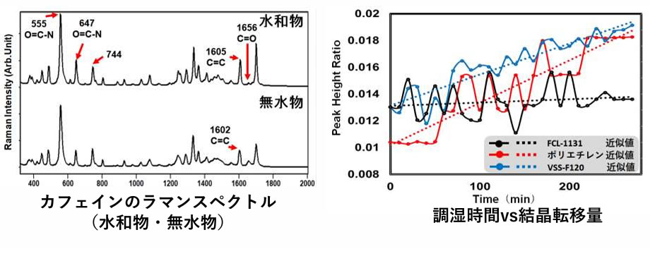 調湿環境下に包装したモデル製剤を設置し、ラマン分光法を用いてモデル製剤の物性変化をリアルタイムで分析・評価を行った事例を紹介する。